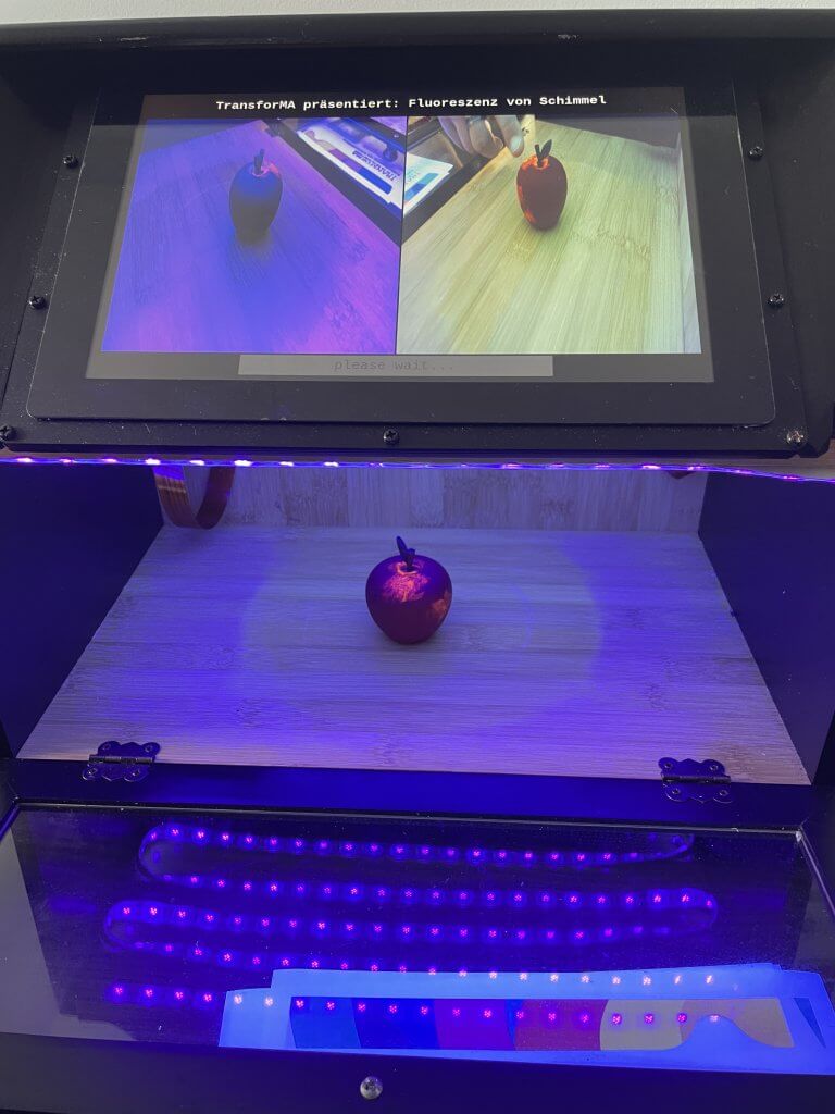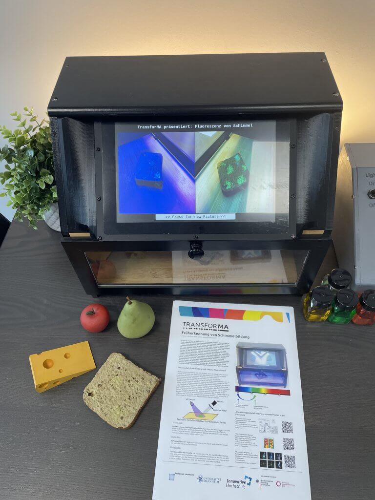 Der Brotkasten-Demonstrator zeigt, wie UV-Fluoreszenz genutzt werden kann, um Schimmel auf Lebensmitteln sichtbar zu machen. Der Brotkasten ist mit zwei Kameras und einer Lampe ausgestattet, die die Lebensmittel im Inneren mit UV-Licht bestrahlt. Bestimmte Schimmelsorten fluoreszieren, wenn sie mit UV-Licht angestrahlt werden, was den Befall auf den Lebensmitteln sichtbar macht. Während eine Kamera im Brotkasten zeigt, was Menschen mit dem bloßen Auge wahrnehmen können, hat die zweite Kamera einen optischen Filter eingebaut. Dieser filtert das violette Licht heraus und schafft ein klares Bild mit mehr Kontrasten, auf dem der Schimmelbefall noch deutlicher als im violetten Licht zu sehen ist. Schimmel kann mit diesem Verfahren der optischen Messtechnik schon in frühen Wachstumsphasen sichtbar gemacht werden, wenn er noch gar nicht mit bloßem Auge erkennbar wäre. So können die verdorbenen Lebensmittel vor versehentlichem Verzehr entsorgt und lebensmittelbedingte Krankheitsfälle vermieden werden.