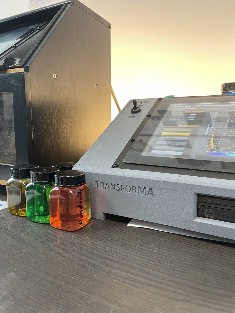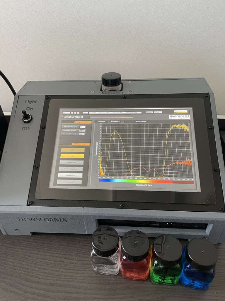Der zweite Demonstrator ist ein Spektrometer, das Licht von einer Seite durch eine Flüssigkeit strahlt und dann mittels eines Sensors die Wellenlängen des Lichts auf der anderen Seite erfasst. Da die Wellenlängen des Lichts für die Farben verantwortlich sind, die Menschen im visuellen Spektrum sehen, kann das Spektrometer die Farben der Flüssigkeit genau erfassen. Das ist beispielsweise in der Produktion von Getränken ein übliches Verfahren: Da eine Farbabweichung des Getränks von Kund*innen als Qualitätsmangel wahrgenommen werden kann, wird mit diesem Verfahren sichergestellt, dass das abgefüllte Getränk immer die exakt gleiche Farbe hat und nicht von Flasche zu Flasche unterschiedlich aussieht. Auch kann man anhand von Veränderungen der Farbe die tatsächliche Qualität des Produktes erkennen, so zum Beispiel bei Olivenöl. Wenn dieses im Sonnenlicht steht, zu warm wird oder Sauerstoff ausgesetzt ist, oxidiert es und wird schlecht. Das Spektrometer erkennt dadurch entstehende minimale Trübungen, da das Öl weniger Licht durchlässt. So können Qualitätsunterschiede genau erfasst werden.