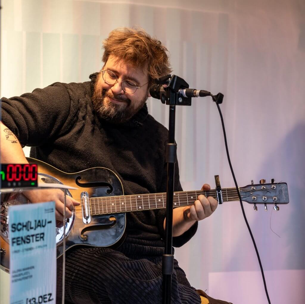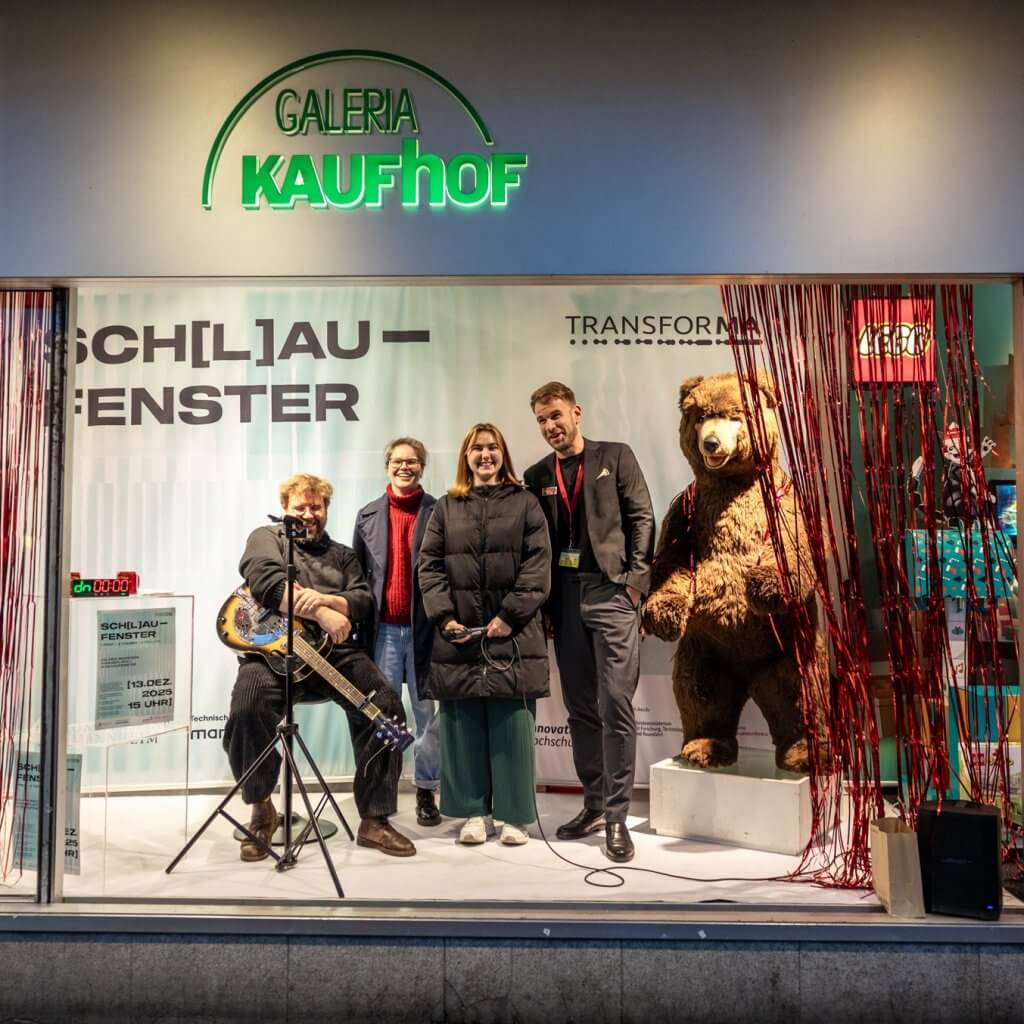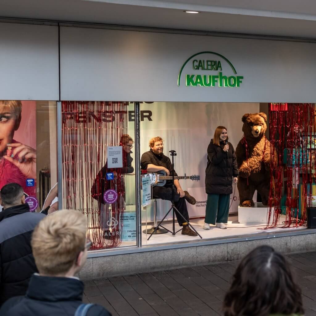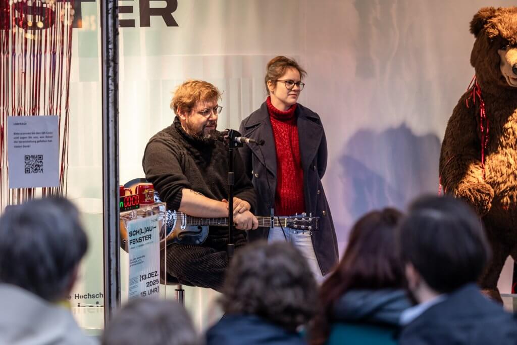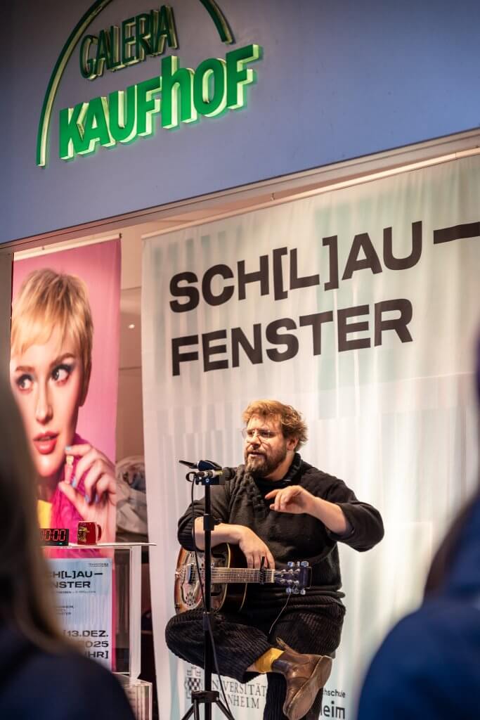 Im geschmückten Schaufenster der GALERIA Mannheim direkt am Paradeplatz sitzt Dr. Hiram Kümper, Projektleiter von TransforMA und Carl-Theodor-Professor an der Universität Mannheim. Er hat seine Gitarre auf dem Schoß, ein lebensgroßer Stoffbär steht rechts neben ihm. Ein Timer, der runterzählt, zeigt an, wie lange es bis zu seinem nächsten Vortrag dauert.